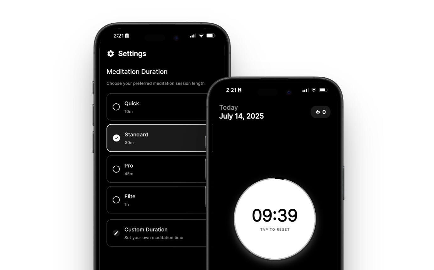 First, choose a meditation time, start the timer, and complete the session by doing absolutely nothing—just sit and focus. Leave early or switch apps, and your streak resets. Complete sessions to grow your streak and add your friends to see their progress 🏆